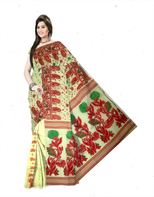 Pradip Fabrics Ethnic Women's Tant Tussar Silk Red and Soft Yellow Color Saree