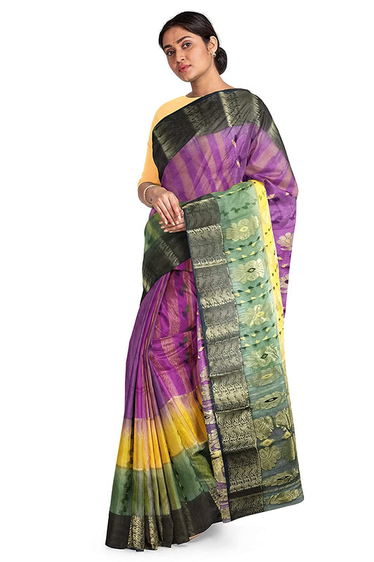 Pradip Fabrics Ethnic Womans Bengali Tant Silk Purple, Yellow and Green Color Sare