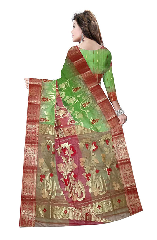 Pradip Fabrics Ethnic Womans Bengali Tant Silk Red and Green Color Sare