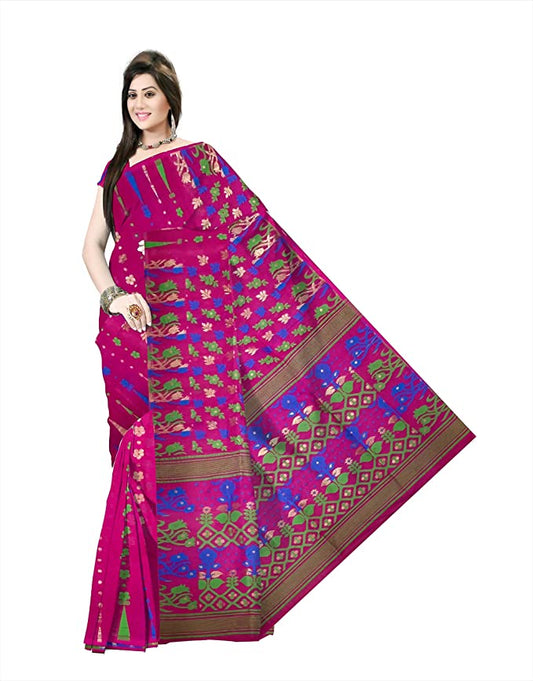 Pradip Fabrics Ethnic Women's All Over Dhakai Jamdani Tant Silk Dark Pink Color Saree