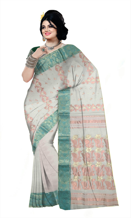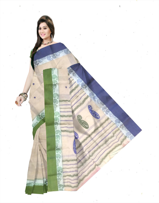 Pradip Fabrics Ethnic Women's Pure 100% Tant Cotton Light Cream Body and Green Border Saree