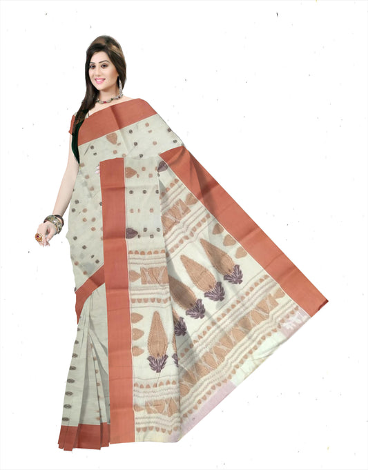 Pradip Fabrics Ethnic Women's Pure 100% Tant Cotton Deep Cream Body and Red Border Saree