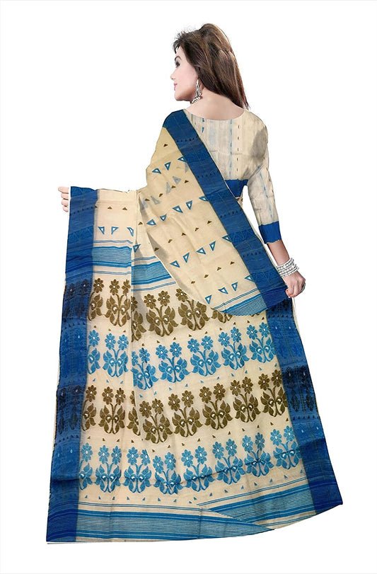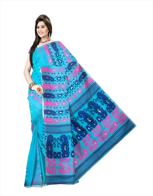 Pradip Fabrics Ethnic Women's Tant All Over Aqua Soft Dhakai Jamdani Saree