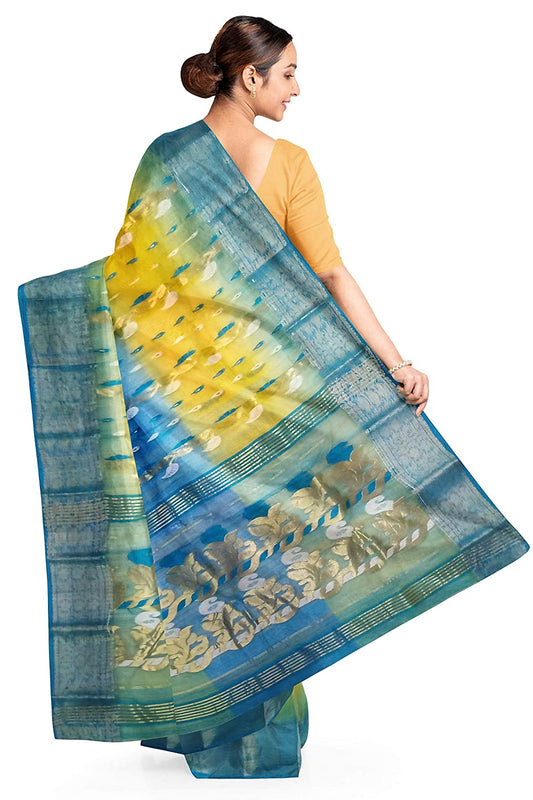 Pradip Fabrics Ethnic Women's Tant Silk Aqua and Yellow Color Saree