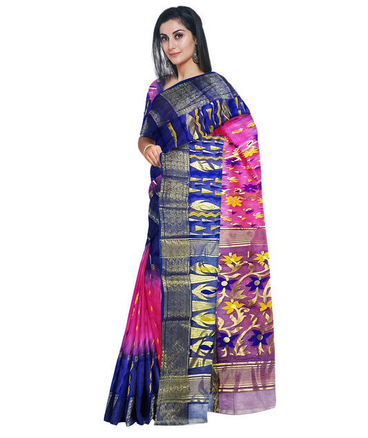 Pradip Fabrics Ethnic Women's Tant Silk Benarasi Blue and Pink Color Saree
