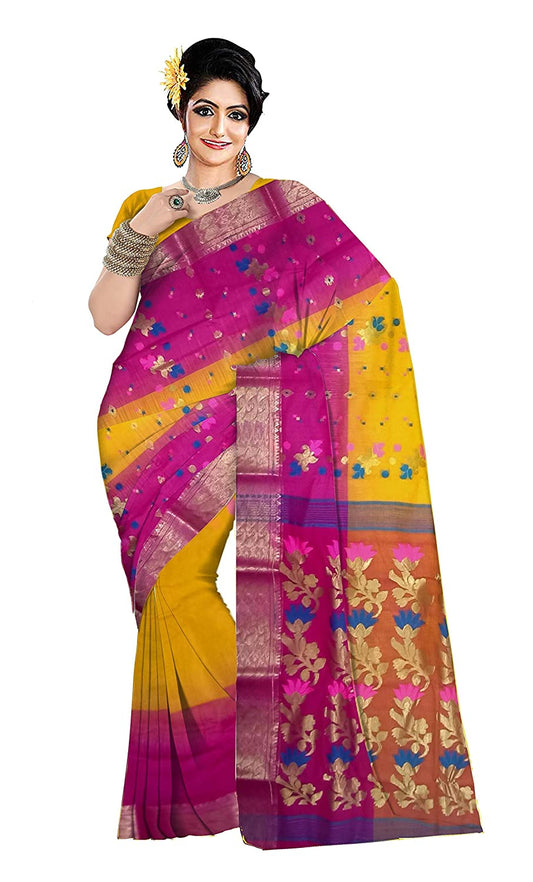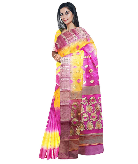 Pradip Fabrics Ethnic Women's Tant Silk Pink and Yellow Color Baluchari Saree