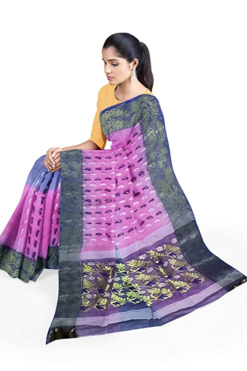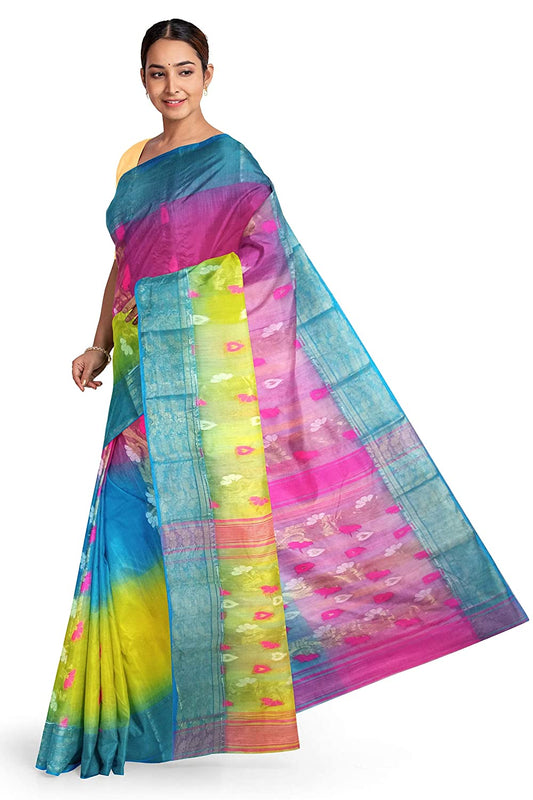 Pradip Fabrics Ethnic Women's Tant Silk Pink, Blue, and Yellow Sare
