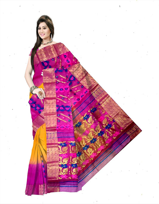 Pradip Fabrics Ethnic Women's Tant Silk Pink and Yellow Color Baluchuri Saree