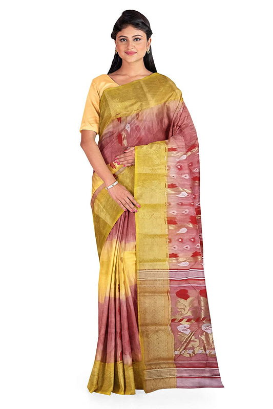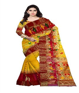 Pradip Fabrics Ethnic Women's Tant Silk Red and Yellow Sare