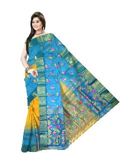 Pradip Fabrics Ethnic Women's Tant Silk Sky blue and Yellow Color Saree