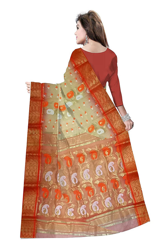 Pradip Fabrics Ethnic Women's Tant Silk Soft Green and Red Color Saree