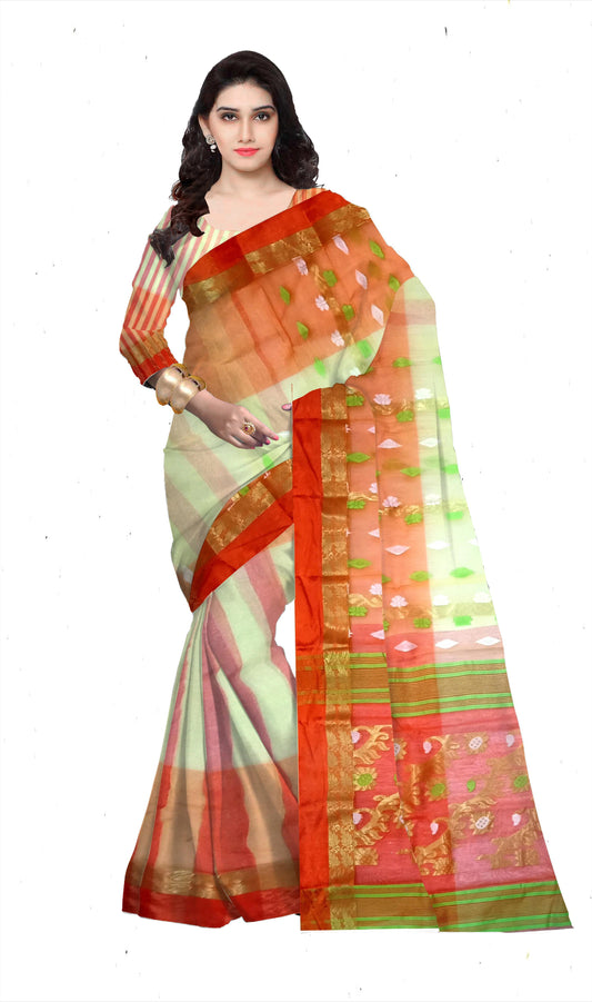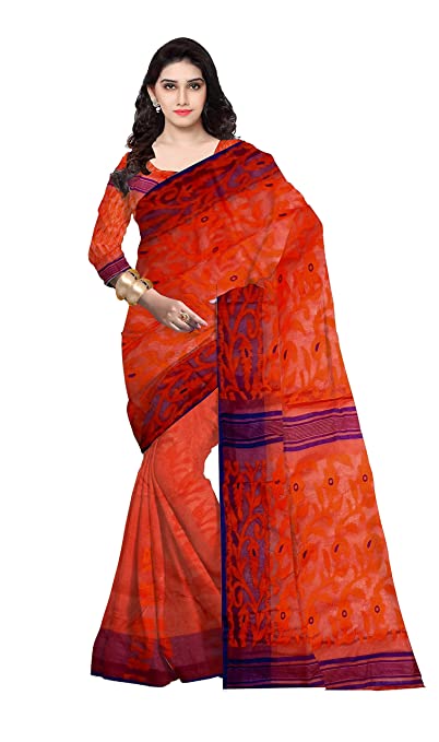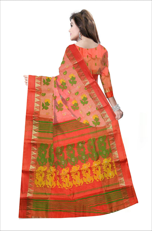 Pradip Fabrics Woven Tant Silk Gap Dhakai Jamdani Orange Saree