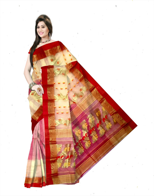 Pradip Fabrics Woven Tant Silk Red & Dark Cream Color Saree
