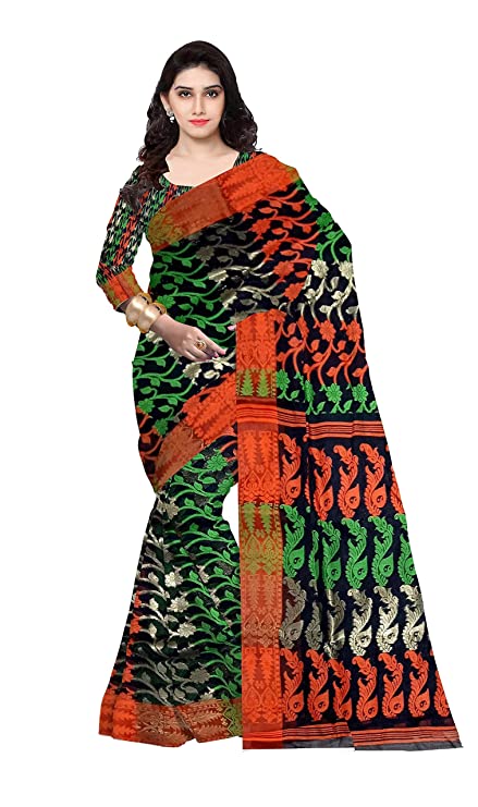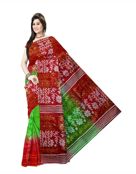 Pradip Fabrics Woven Tant Cotton All Over Dhakai Jamdani Green and Red Saree