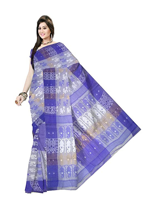 Pradip Fabrics Woven Tant Cotton All Over Dhakai Jamdani White and Blue Saree