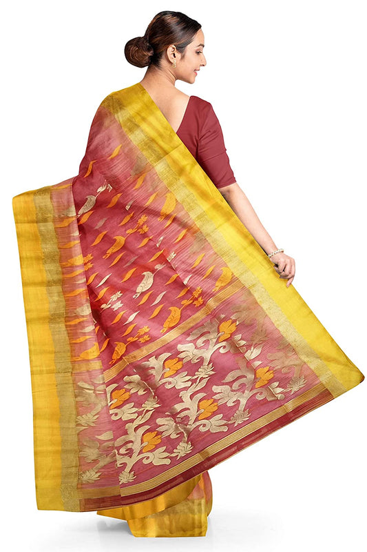 Pradip Fabrics Woven Tant Silk Blend Yellow and Red Baluchuri Saree