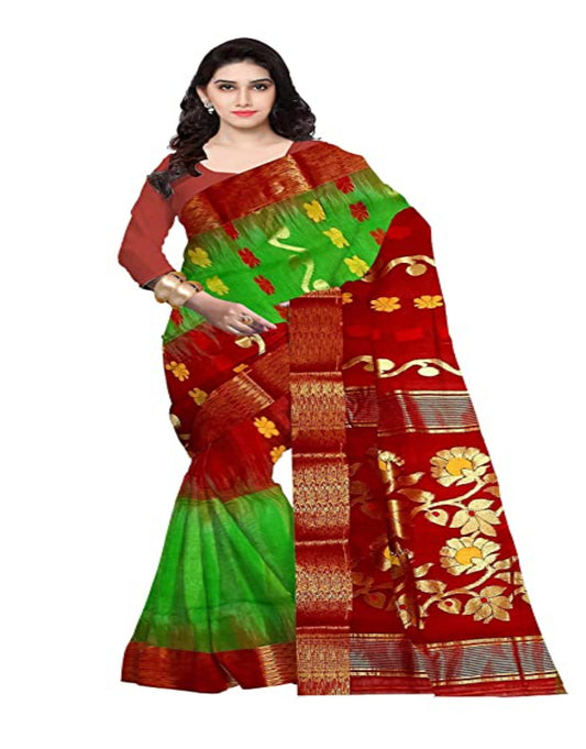 Pradip Fabrics Ethnic Women's Tant Silk Green and Red Color Baluchuri Saree