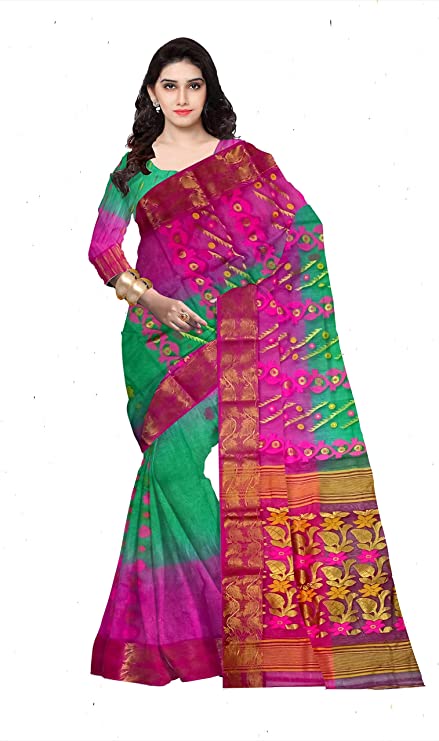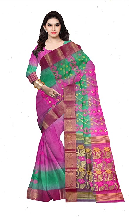 Pradip Fabrics Ethnic Women's Tant Silk Pink and Green Color Baluchuri Saree