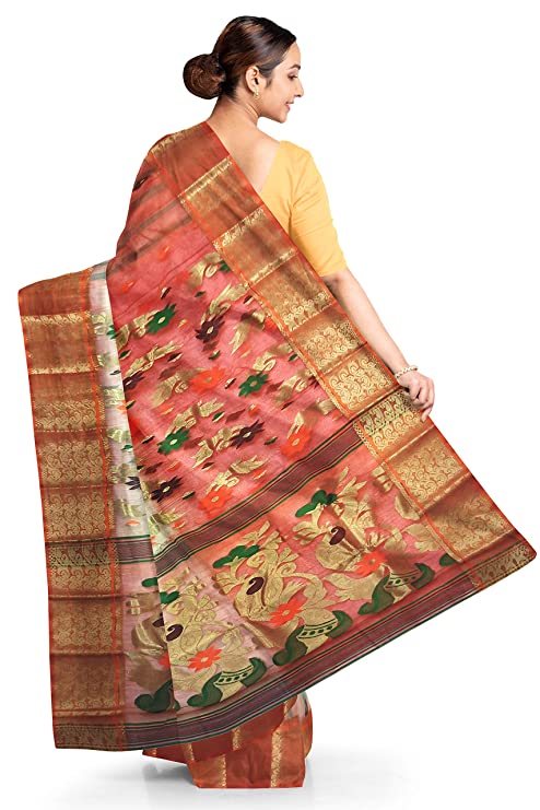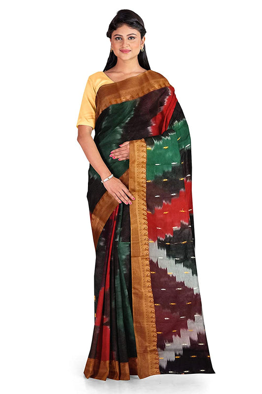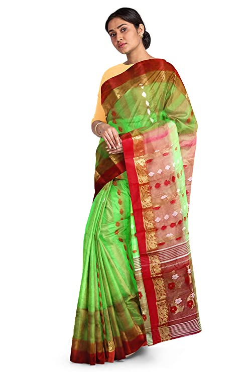 Pradip Fabrics Ethnic Women's Tant Silk Green and Red Color Baluchuri Saree