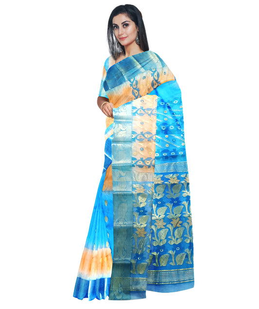 Pradip Fabrics Ethnic Women's Tant Tussar Silk Orange and Light Blue Color Saree