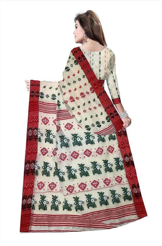 Pradip Fabrics Ethnic Women's Cotton Tant Baluchari White and Red Color Saree